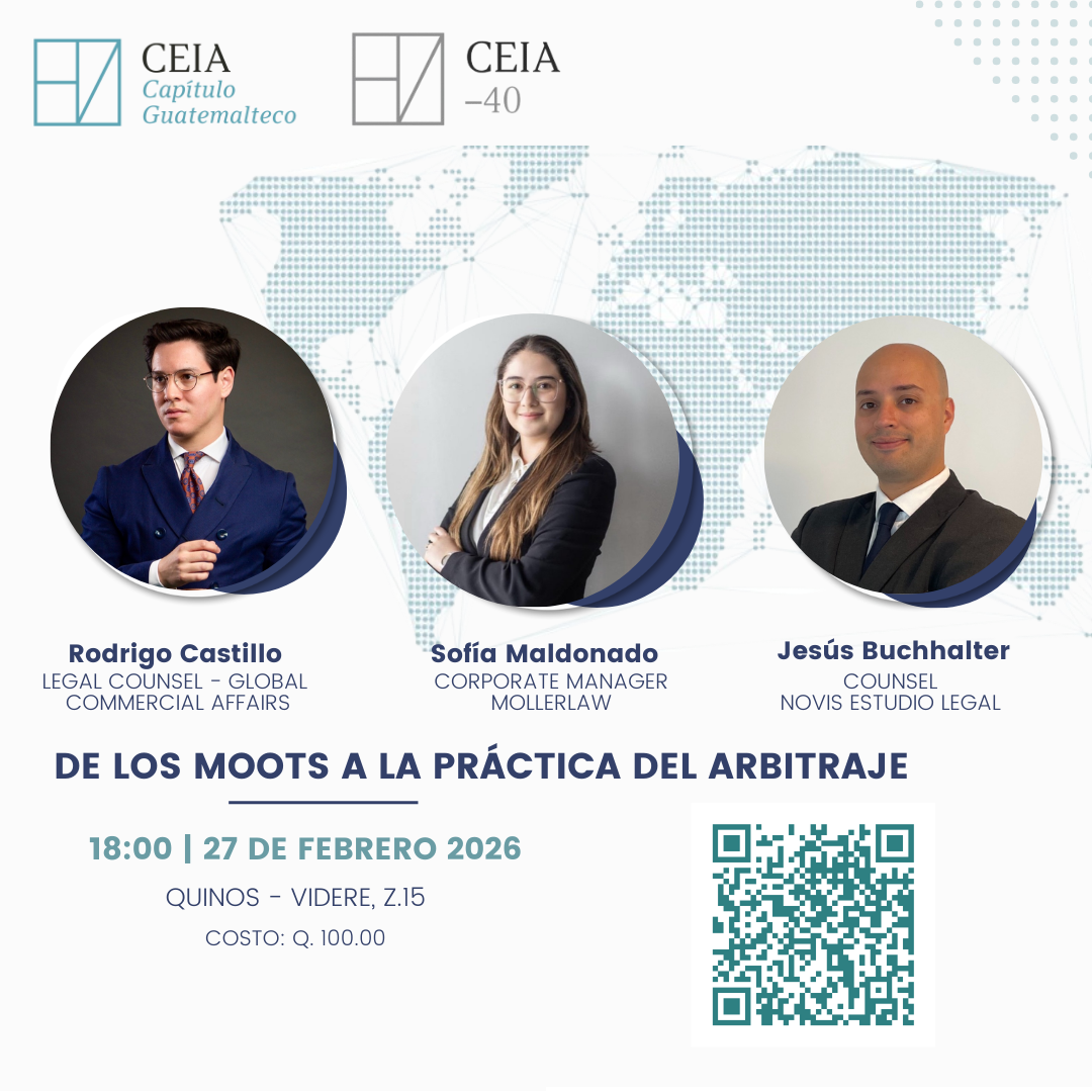 El CEIA-40, Capítulo de Guatemela, organiza el 27 de febrero de 2026, a las 18:00 horas, el evento titulado «De los Moots a la práctica del arbitraje», en Quinos (Videre, zona 15).