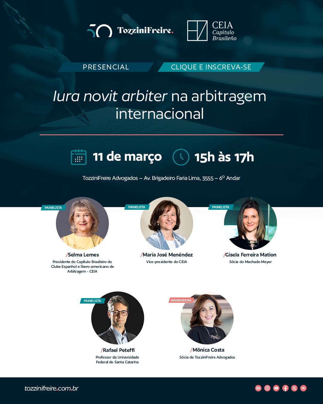El Capítulo brasileño del CEIA organiza el 11 de marzo de 2026 el evento titulado «Iura novit arbiter na arbitragem internacional», en las oficinas de TozziniFreire (Sao Paulo).