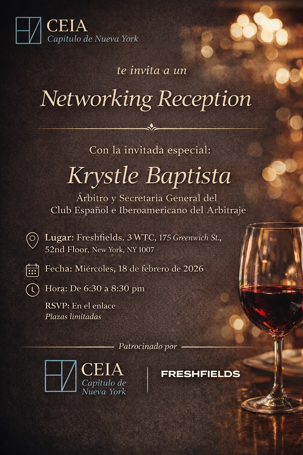 El Capítulo de Nueva York del CEIA tiene el gusto de invitarles a una recepción de networking con la invitada especial Krystle Baptista, Árbitro y Secretaria General del CEIA.